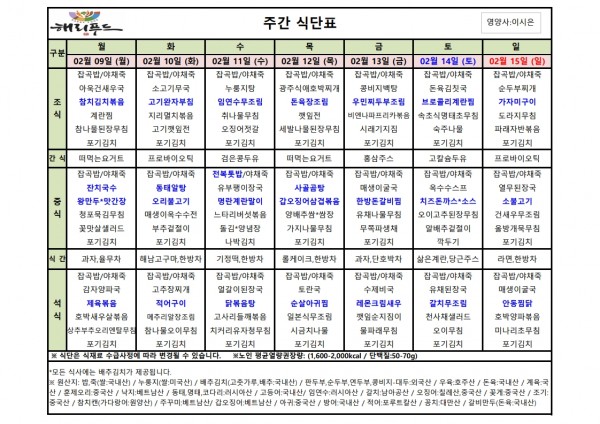 2월 둘째주 식단표 페이지 정보 작성자 은천노인복지회 작성일26-02-06 11:17 조회4,217회 댓글0건 관련링크 이전글 다음글 목록 답변 본문 2월 둘째주 어르신 식단표 안내해 드립니다. 정성과 영양을 담아 준비하겠습니다. 이전글 다음글 목록 답변