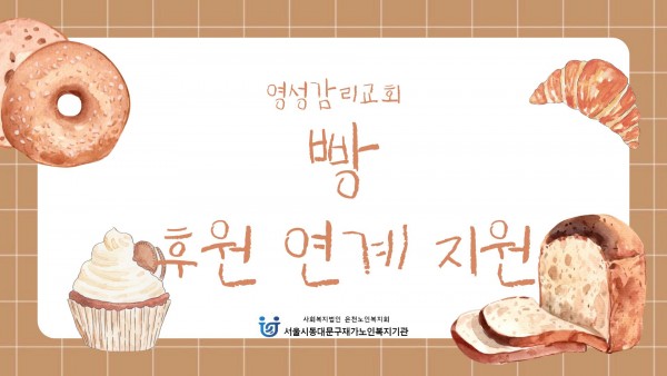 [재가노인지원서비스] 2026년 3월 영성감리교회(빵) 후원 페이지 정보 작성자 은천노인복지회 작성일26-04-06 11:18 조회23회 댓글0건 관련링크 이전글 다음글 목록 답변 본문 기관 인근에 위치한 '영성감리교회'에서 빵(단팥, 소보로, 완두앙금) 200개를 후원해주셨습니다. 이전글 다음글 목록 답변