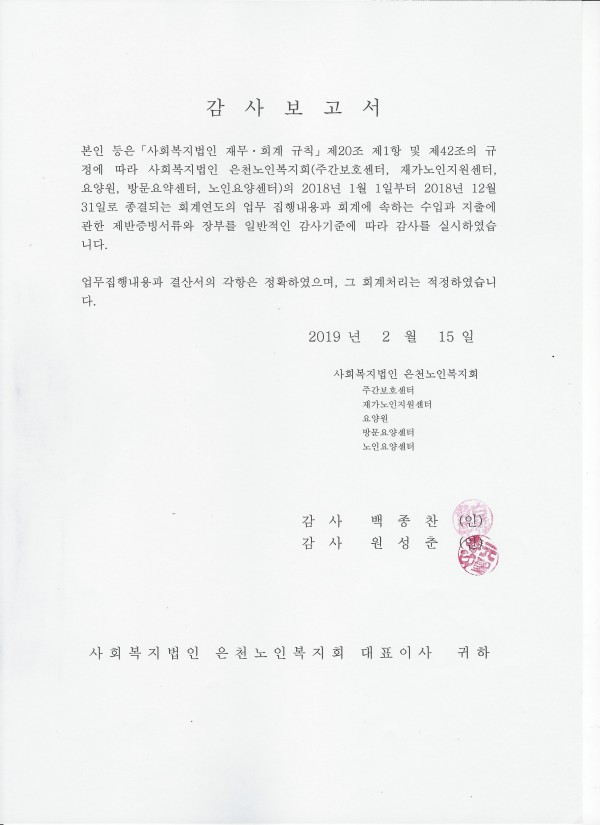 2018년 법인회계감사 보고서 페이지 정보 작성자 은천노인복지회 작성일19-02-27 14:31 조회140,661회 댓글0건 관련링크 이전글 다음글 목록 답변 본문 2018년 법인회계감사 보고서입니다. 이전글 다음글 목록 답변
