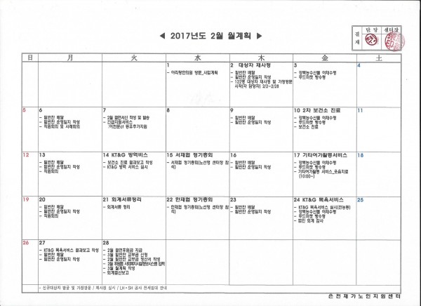 2017년 2월 월계획 페이지 정보 작성자 은천노인복지회 작성일17-02-01 17:47 조회79,536회 댓글0건 관련링크 이전글 다음글 목록 답변 본문 은천재가노인지원센터 2017년 2월 월계획 이전글 다음글 목록 답변