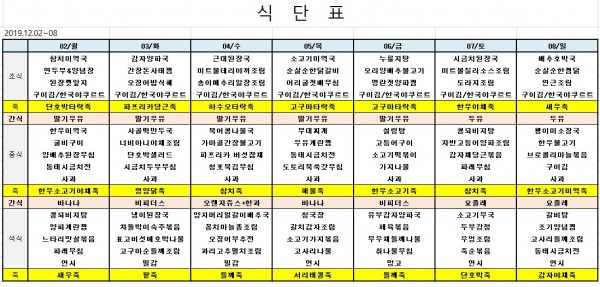 12월첫째주식단표 페이지 정보 작성자 은천노인복지회 작성일19-12-02 18:02 조회39,323회 댓글0건 관련링크 이전글 다음글 목록 답변 본문 ※ 모든 식사에는 잡곡밥과 김치가 제공됩니다. ※ 식단은 식재료수급에 의해 변경될 수 있습니다. 이전글 다음글 목록 답변