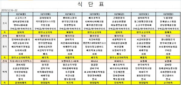 12월 셋째주 식단표 페이지 정보 작성자 은천노인복지회 작성일19-12-15 15:47 조회38,277회 댓글0건 관련링크 이전글 다음글 목록 답변 본문 ※ 모든 식사에는 잡곡밥과 김치가 제공됩니다. ※ 식단은 식재료수급에 의해 변경될 수 있습니다. 이전글 다음글 목록 답변