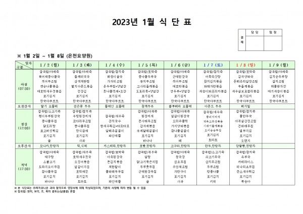 23년 1월 첫째주 식단표 페이지 정보 작성자 은천노인복지회 작성일22-12-30 15:21 조회86,724회 댓글0건 관련링크 이전글 다음글 목록 답변 본문 . 이전글 다음글 목록 답변