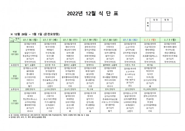 12월 넷째주 식단표 페이지 정보 작성자 은천노인복지회 작성일22-12-26 14:01 조회87,945회 댓글0건 관련링크 이전글 다음글 목록 답변 본문 . 이전글 다음글 목록 답변