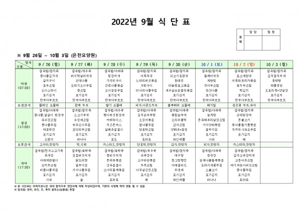 9월 다섯째주 식단표 페이지 정보 작성자 은천노인복지회 작성일22-09-22 17:36 조회96,409회 댓글0건 관련링크 이전글 다음글 목록 답변 본문 . 이전글 다음글 목록 답변