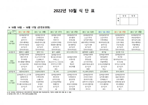 10월 둘째주 식단표 페이지 정보 작성자 은천노인복지회 작성일22-10-06 15:49 조회95,785회 댓글0건 관련링크 이전글 다음글 목록 답변 본문 . 이전글 다음글 목록 답변