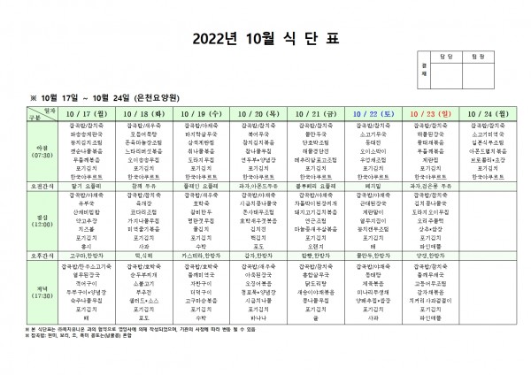 10월 셋째주 식단표 페이지 정보 작성자 은천노인복지회 작성일22-10-13 17:30 조회95,256회 댓글0건 관련링크 이전글 다음글 목록 답변 본문 . 이전글 다음글 목록 답변