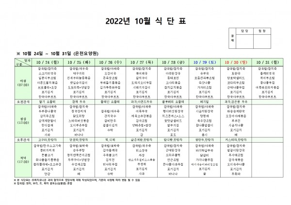 10월 넷째주 식단표 페이지 정보 작성자 은천노인복지회 작성일22-10-20 15:06 조회94,386회 댓글0건 관련링크 이전글 다음글 목록 답변 본문 . 이전글 다음글 목록 답변