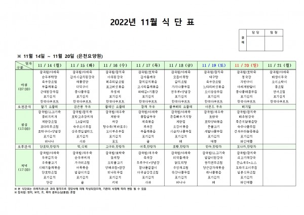 11월 셋째주 식단표 페이지 정보 작성자 은천노인복지회 작성일22-11-10 10:10 조회92,192회 댓글0건 관련링크 이전글 다음글 목록 답변 본문 . 이전글 다음글 목록 답변