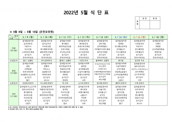 5월 둘째주 식단표 페이지 정보 작성자 은천노인복지회 작성일22-05-06 10:04 조회107,555회 댓글0건 관련링크 이전글 다음글 목록 답변 본문 . 이전글 다음글 목록 답변