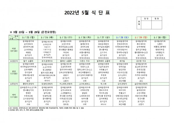 5월 넷째주 식단표 페이지 정보 작성자 은천노인복지회 작성일22-05-19 16:56 조회106,175회 댓글0건 관련링크 이전글 다음글 목록 답변 본문 . 이전글 다음글 목록 답변
