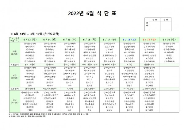 6월 셋째주 식단표 페이지 정보 작성자 은천노인복지회 작성일22-06-10 18:17 조회104,176회 댓글0건 관련링크 이전글 다음글 목록 답변 본문 . 이전글 다음글 목록 답변