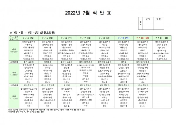 7월 첫째주 식단표 페이지 정보 작성자 은천노인복지회 작성일22-06-30 17:17 조회102,299회 댓글0건 관련링크 이전글 다음글 목록 답변 본문 . 이전글 다음글 목록 답변