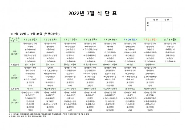 7월 넷째주 식단표 페이지 정보 작성자 은천노인복지회 작성일22-07-21 17:04 조회102,403회 댓글0건 관련링크 이전글 다음글 목록 답변 본문 . 이전글 다음글 목록 답변