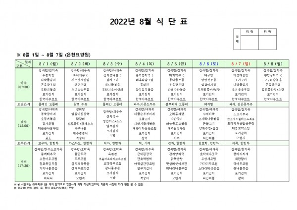 8월 첫째주 식단표 페이지 정보 작성자 은천노인복지회 작성일22-08-01 13:36 조회101,671회 댓글0건 관련링크 이전글 다음글 목록 답변 본문 . 이전글 다음글 목록 답변