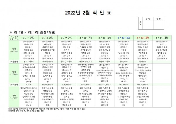 2월 둘째주 식단표 페이지 정보 작성자 은천노인복지회 작성일22-02-04 18:58 조회120,089회 댓글0건 관련링크 이전글 다음글 목록 답변 본문 . 이전글 다음글 목록 답변