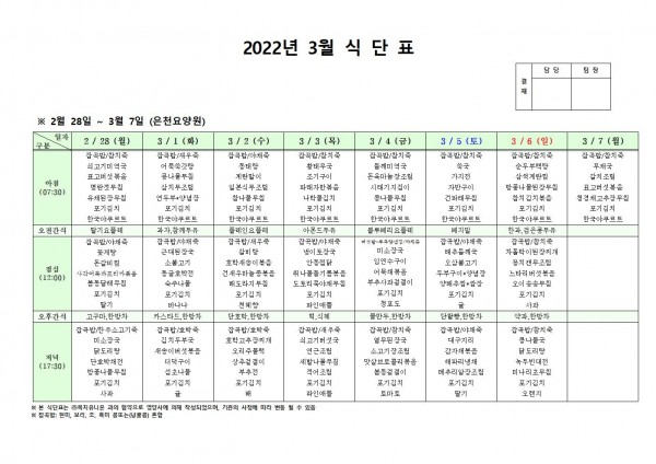 3월 첫째주 식단표 페이지 정보 작성자 은천노인복지회 작성일22-02-25 09:22 조회117,055회 댓글0건 관련링크 이전글 다음글 목록 답변 본문 . 이전글 다음글 목록 답변