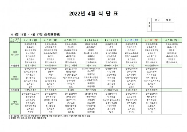 4월 둘째주 식단표 페이지 정보 작성자 은천노인복지회 작성일22-04-11 16:27 조회111,872회 댓글0건 관련링크 이전글 다음글 목록 답변 본문 . 이전글 다음글 목록 답변