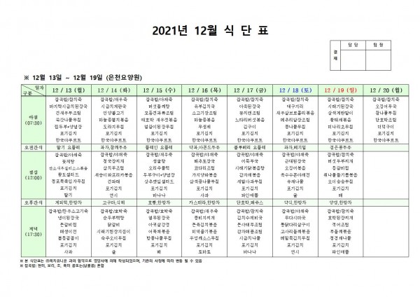 12월 셋째주 식단표 페이지 정보 작성자 은천노인복지회 작성일21-12-15 11:52 조회123,187회 댓글0건 관련링크 이전글 다음글 목록 답변 본문 . 이전글 다음글 목록 답변