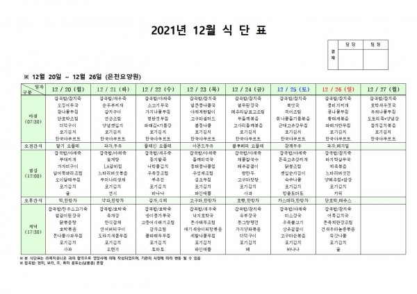 12월 넷째주 식단표 페이지 정보 작성자 은천노인복지회 작성일21-12-16 17:24 조회122,753회 댓글0건 관련링크 이전글 다음글 목록 답변 본문 . 이전글 다음글 목록 답변