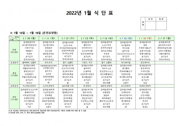 1월 둘째주 식단표 페이지 정보 작성자 은천노인복지회 작성일22-01-07 10:03 조회121,877회 댓글0건 관련링크 이전글 다음글 목록 답변 본문 . 이전글 다음글 목록 답변