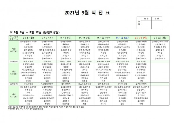 9월 둘째주 식단표 페이지 정보 작성자 은천노인복지회 작성일21-09-02 16:30 조회129,297회 댓글0건 관련링크 이전글 다음글 목록 답변 본문 . 이전글 다음글 목록 답변
