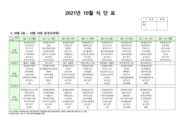 10월 첫째주 식단표 페이지 정보 작성자 은천노인복지회 작성일21-09-30 16:01 조회127,992회 댓글0건 관련링크 이전글 다음글 목록 답변 본문 . 이전글 다음글 목록 답변