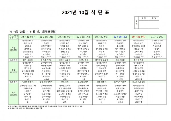 10월 넷째주 식단표 페이지 정보 작성자 은천노인복지회 작성일21-10-26 08:56 조회126,790회 댓글0건 관련링크 이전글 다음글 목록 답변 본문 . 이전글 다음글 목록 답변