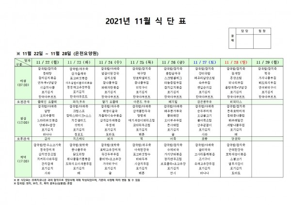 11월 넷째주 식단표 페이지 정보 작성자 은천노인복지회 작성일21-11-25 17:12 조회125,859회 댓글0건 관련링크 이전글 다음글 목록 답변 본문 . 이전글 다음글 목록 답변