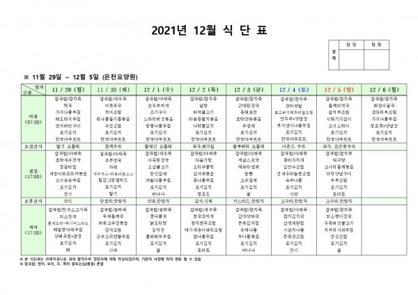 12월 첫째주 식단표 페이지 정보 작성자 은천노인복지회 작성일21-11-25 17:12 조회125,186회 댓글0건 관련링크 이전글 다음글 목록 답변 본문 . 이전글 다음글 목록 답변