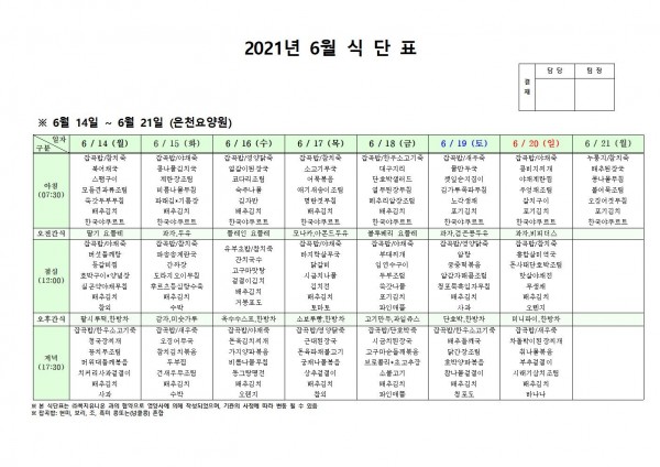 6월 셋째주 식단표 페이지 정보 작성자 은천노인복지회 작성일21-06-11 10:28 조회134,568회 댓글0건 관련링크 이전글 다음글 목록 답변 본문 . 이전글 다음글 목록 답변