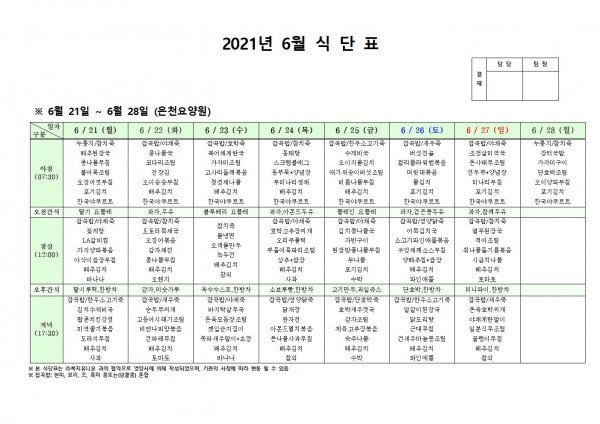 6월 넷째주 식단표 페이지 정보 작성자 은천노인복지회 작성일21-06-17 15:01 조회134,170회 댓글0건 관련링크 이전글 다음글 목록 답변 본문 . 이전글 다음글 목록 답변