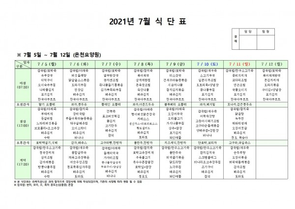 7월 첫째주 식단표 페이지 정보 작성자 은천노인복지회 작성일21-07-02 16:57 조회134,518회 댓글0건 관련링크 이전글 다음글 목록 답변 본문 . 이전글 다음글 목록 답변