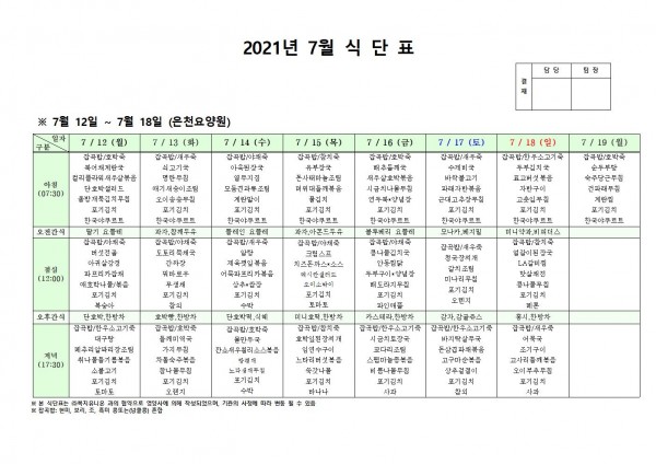 7월 둘째주 식단표 페이지 정보 작성자 은천노인복지회 작성일21-07-22 11:18 조회133,408회 댓글0건 관련링크 이전글 다음글 목록 답변 본문 . 이전글 다음글 목록 답변