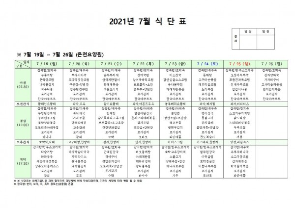 7월 셋째주 식단표 페이지 정보 작성자 은천노인복지회 작성일21-07-22 11:18 조회133,208회 댓글0건 관련링크 이전글 다음글 목록 답변 본문 . 이전글 다음글 목록 답변