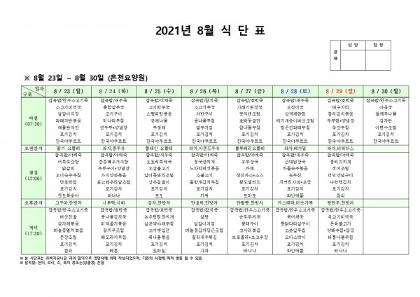 8월 넷째주 식단표 페이지 정보 작성자 은천노인복지회 작성일21-08-19 17:44 조회131,598회 댓글0건 관련링크 이전글 다음글 목록 답변 본문 . 이전글 다음글 목록 답변