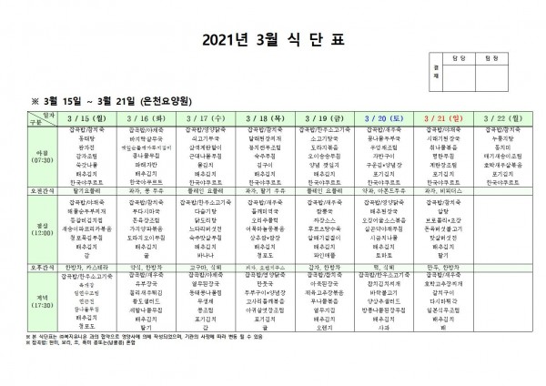 3월 셋째주 식단표 페이지 정보 작성자 은천노인복지회 작성일21-03-12 11:41 조회144,265회 댓글0건 관련링크 이전글 다음글 목록 답변 본문 3월 셋째주 식단표[이 게시물은 은천노인복지회님에 의해 2021-03-12 17:18:24 공지사항에서 이동 됨] 이전글 다음글 목록 답변