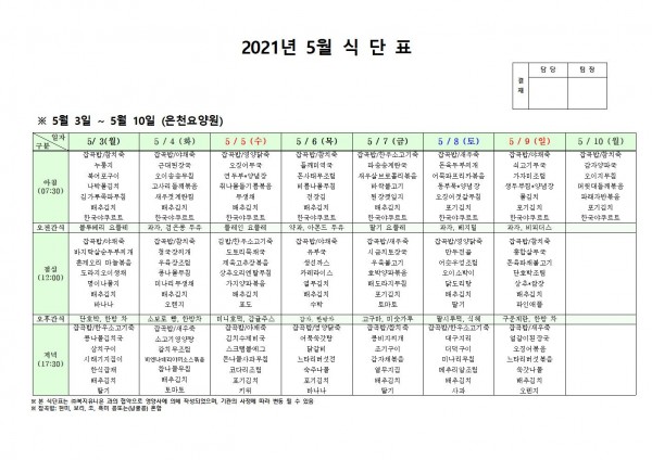 5월 첫째주 식단표 페이지 정보 작성자 은천노인복지회 작성일21-05-03 13:44 조회138,710회 댓글0건 관련링크 이전글 다음글 목록 답변 본문 5월 식단표 이전글 다음글 목록 답변