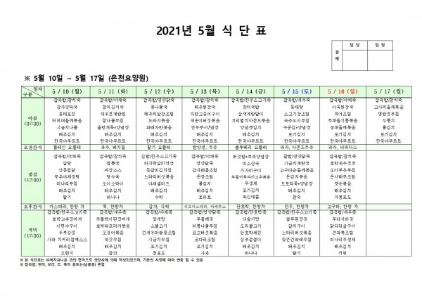 5월 둘째주 식단표 페이지 정보 작성자 은천노인복지회 작성일21-05-06 22:23 조회137,950회 댓글0건 관련링크 이전글 다음글 목록 답변 본문 5월 둘째주 식단표 이전글 다음글 목록 답변
