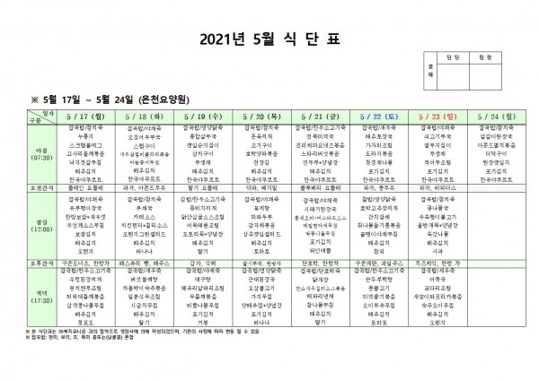 5월 셋째주 식단표 페이지 정보 작성자 은천노인복지회 작성일21-05-13 19:27 조회136,966회 댓글0건 관련링크 이전글 다음글 목록 답변 본문 5월 셋째주 식단표 이전글 다음글 목록 답변