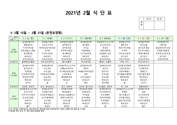 2월 셋째주 식단표 페이지 정보 작성자 은천노인복지회 작성일21-02-15 14:12 조회147,285회 댓글0건 관련링크 이전글 다음글 목록 답변 본문 2월 식단표 [이 게시물은 은천노인복지회님에 의해 2021-03-12 17:18:24 공지사항에서 이동 됨] 이전글 다음글 목록 답변
