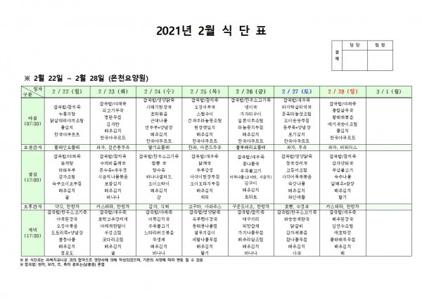 2월 넷째주 식단표 페이지 정보 작성자 은천노인복지회 작성일21-02-19 12:05 조회145,743회 댓글0건 관련링크 이전글 다음글 목록 답변 본문 2월 4주 식단표 [이 게시물은 은천노인복지회님에 의해 2021-03-12 17:18:24 공지사항에서 이동 됨] 이전글 다음글 목록 답변