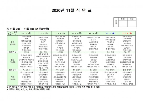 11월 첫째주 식단표 페이지 정보 작성자 은천노인복지회 작성일20-11-13 13:47 조회157,042회 댓글0건 관련링크 이전글 다음글 목록 답변 본문 . 이전글 다음글 목록 답변
