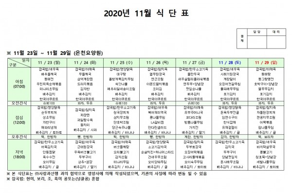 11월 넷째주 식단표 페이지 정보 작성자 은천노인복지회 작성일20-12-08 18:10 조회154,395회 댓글0건 관련링크 이전글 다음글 목록 답변 본문 . 이전글 다음글 목록 답변