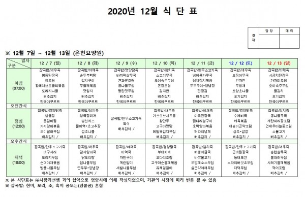 12월 둘째주 식단표 페이지 정보 작성자 은천노인복지회 작성일20-12-08 18:11 조회154,109회 댓글0건 관련링크 이전글 다음글 목록 답변 본문 . 이전글 다음글 목록 답변
