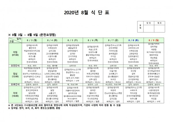8월 첫째주 식단표 페이지 정보 작성자 은천노인복지회 작성일20-08-10 11:33 조회164,873회 댓글0건 관련링크 이전글 다음글 목록 답변 본문 , 이전글 다음글 목록 답변