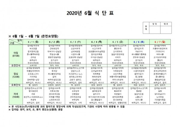 6월 첫째주 식단표 페이지 정보 작성자 은천노인복지회 작성일20-06-09 09:32 조회171,082회 댓글0건 관련링크 이전글 다음글 목록 답변 본문 호 이전글 다음글 목록 답변