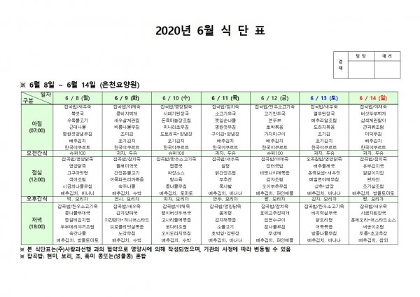 6월 둘째주 식단표 페이지 정보 작성자 은천노인복지회 작성일20-06-15 12:49 조회170,539회 댓글0건 관련링크 이전글 다음글 목록 답변 본문 ㅣ; 이전글 다음글 목록 답변
