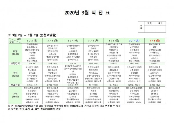 3월 첫째주 식단표 페이지 정보 작성자 은천노인복지회 작성일20-03-09 11:55 조회180,414회 댓글0건 관련링크 이전글 다음글 목록 답변 본문 . 이전글 다음글 목록 답변