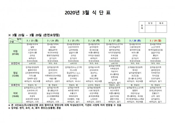 3월 넷째주 식단표 페이지 정보 작성자 은천노인복지회 작성일20-03-31 16:09 조회180,319회 댓글0건 관련링크 이전글 다음글 목록 답변 본문 . 이전글 다음글 목록 답변
